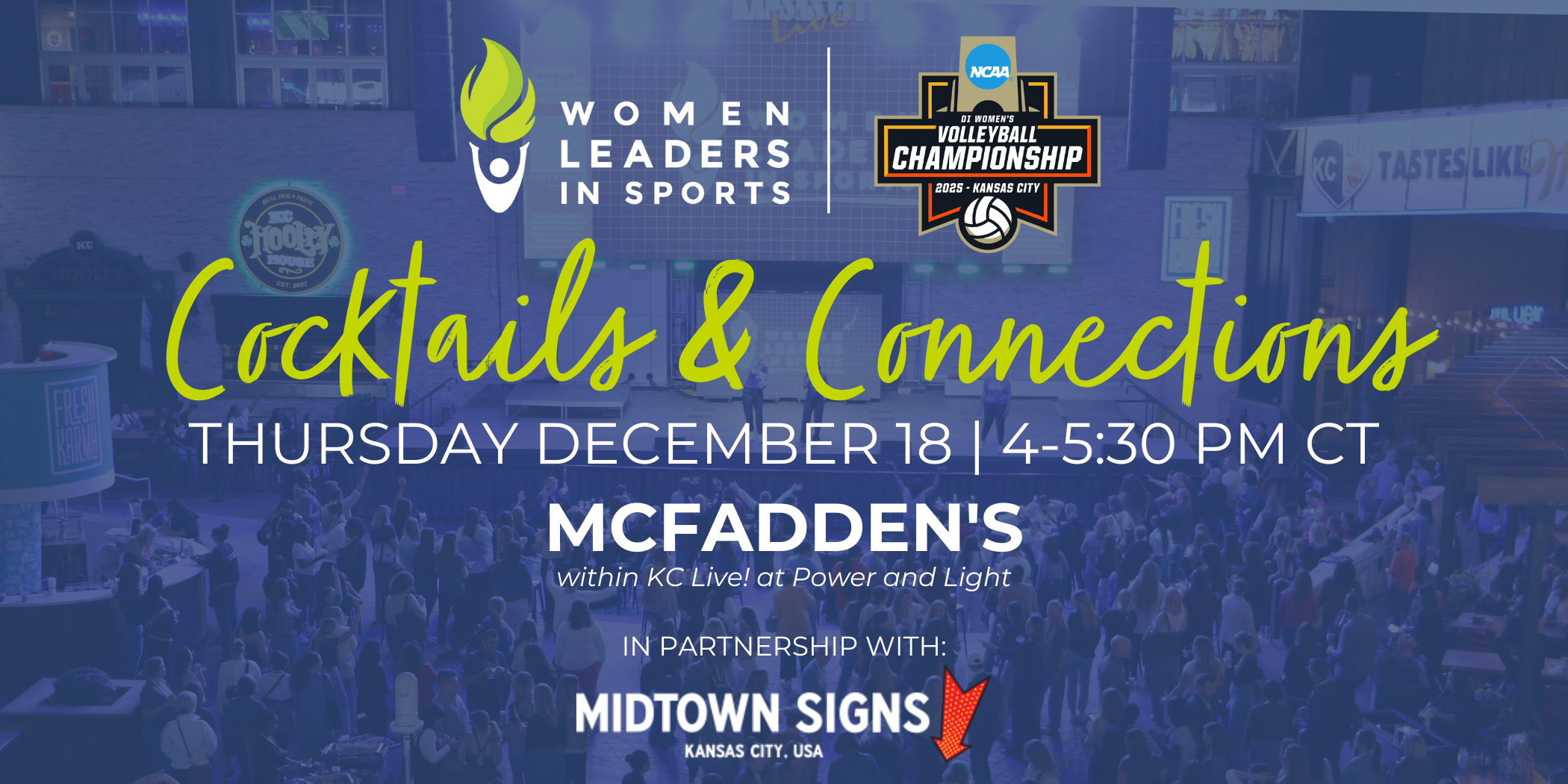 Join Women Leaders during the NCAA DI Women’s Volleyball Championship for Cocktails and Connections at McFadden’s, located across from T-Mobile Center, within KC Live! at Power and Light. Light food and drinks will be provided before the semifinal matches!